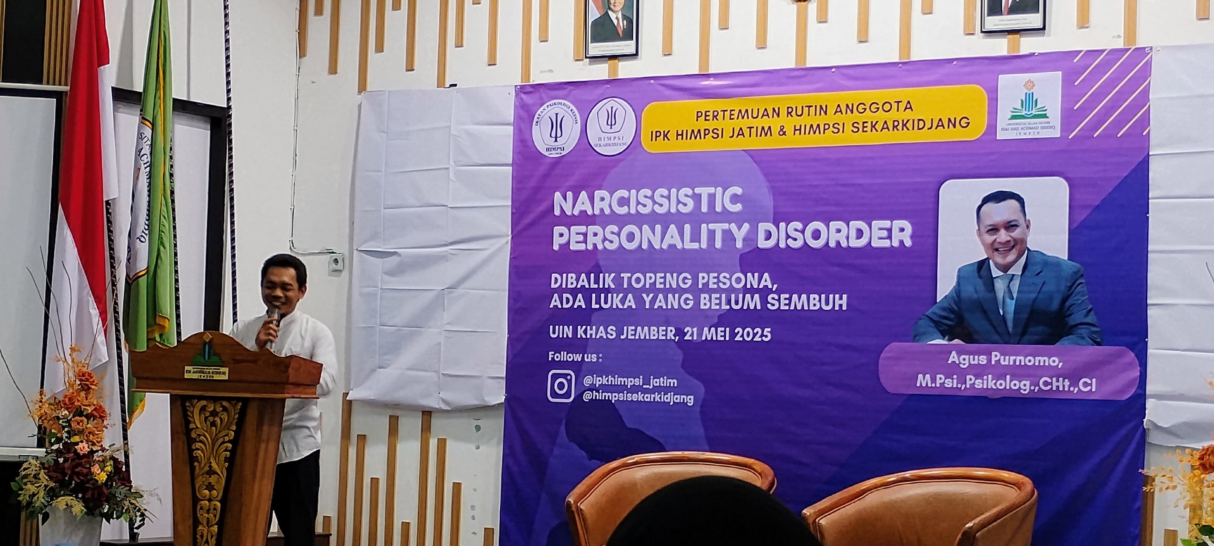 UIN KHAS Jember melalui Fakultas Dakwah Program Studi Psikologi Islam menjalin kerjasama dengan IPK HIMPSI Jawa Timur dan HIMPSI Sekarkidjang dalam menyelenggarakan seminar bertajuk "Narcissistic Personality Disorder (NPD): Di Balik Topeng Pesona, Ada Luka yang Belum Sembuh." Kegiatan ini dilaksanakan pada Rabu, 21 Mei 2025, bertempat di Aula Perpustakaan UIN KHAS Jember, pukul 15.00 hingga 18.00 WIB.